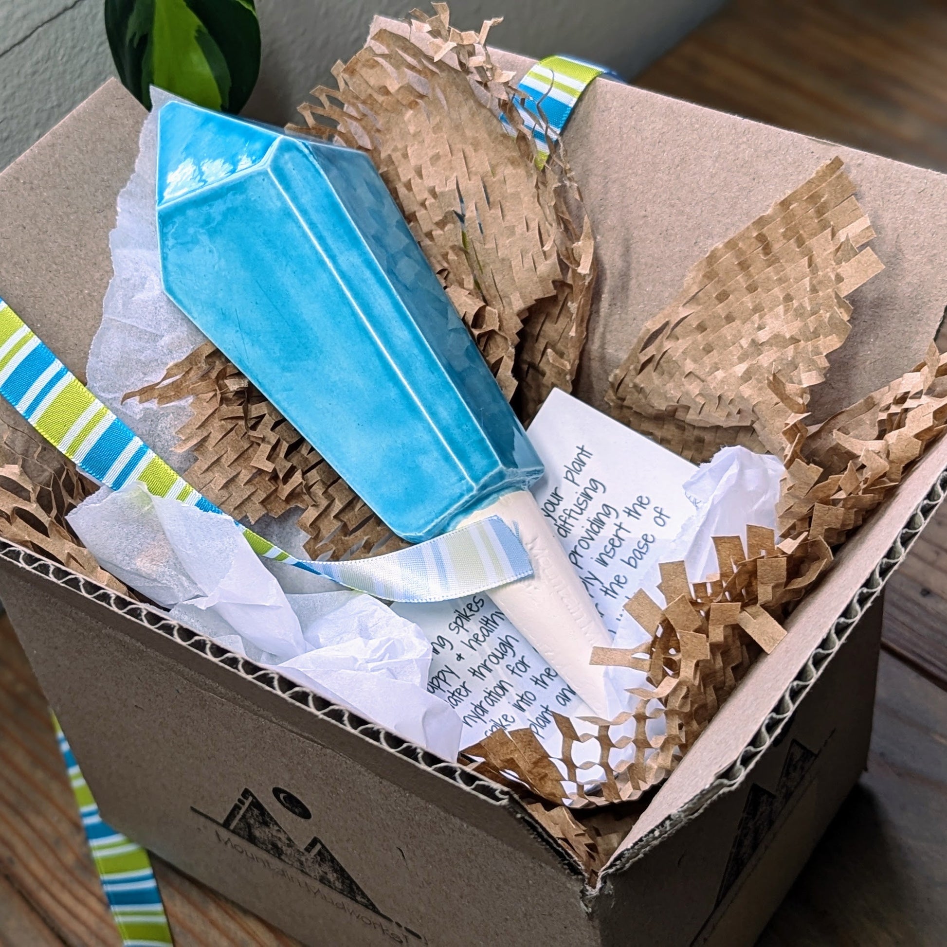 This hand-crafted crystal watering spike is a fun and dazzling addition for large plants! A fantastic gift for plant lovers or use it to simplify your own plant care. It can be a lifesaver (literally) when you go on vacation for a few days. Available EXCLUSIVELY from Mountain Mudworks!